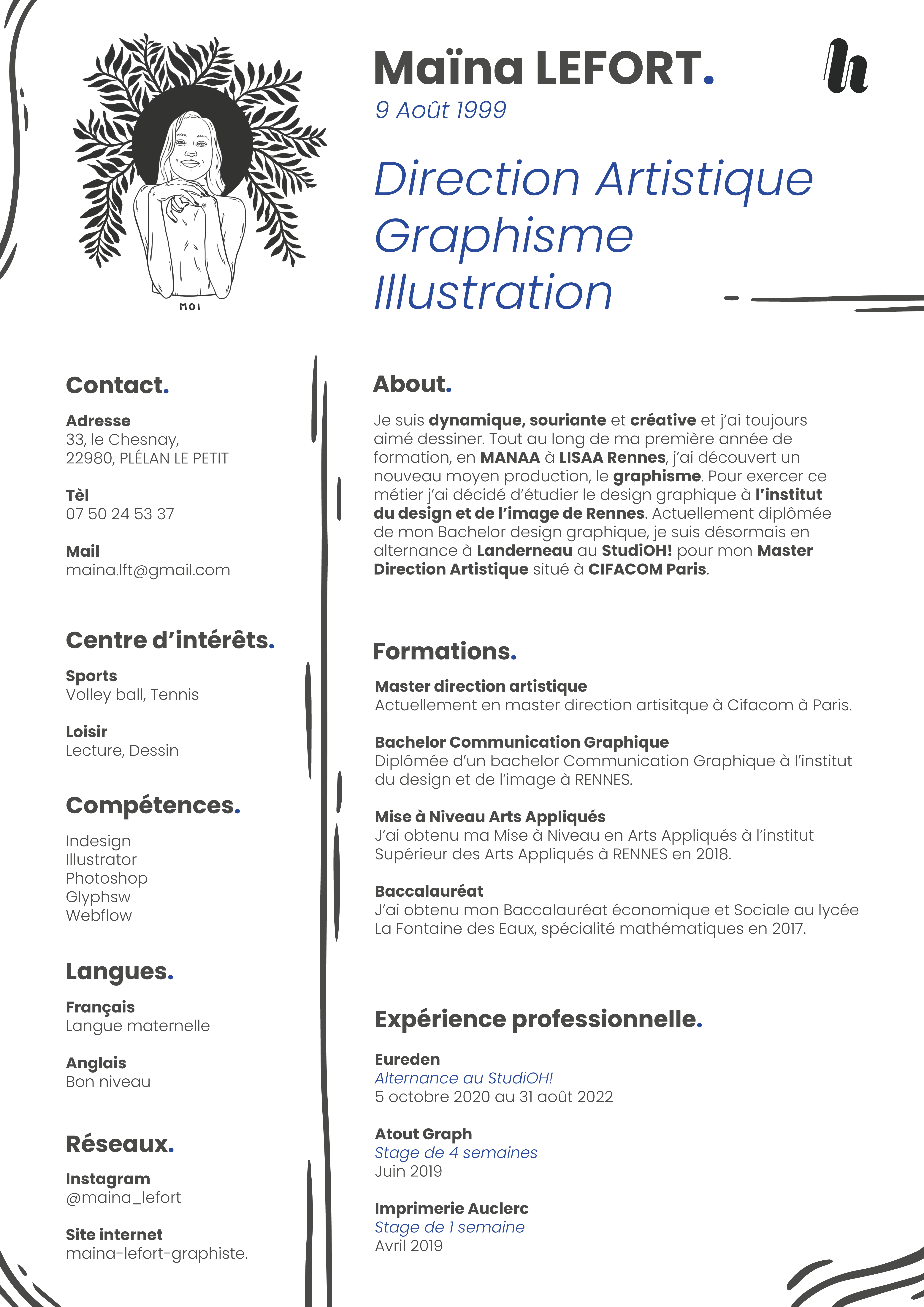 Pour exercer ce métier j'ai décidé d'étudier le design graphique à l'institut du design et de l'image de Rennes. Actuellement diplômée de mon Bachelor design graphique, je suis désormais en alternance à Landerneau au StudiOH! pour mon Master Direction Artistique situé à CIFACOM Paris.